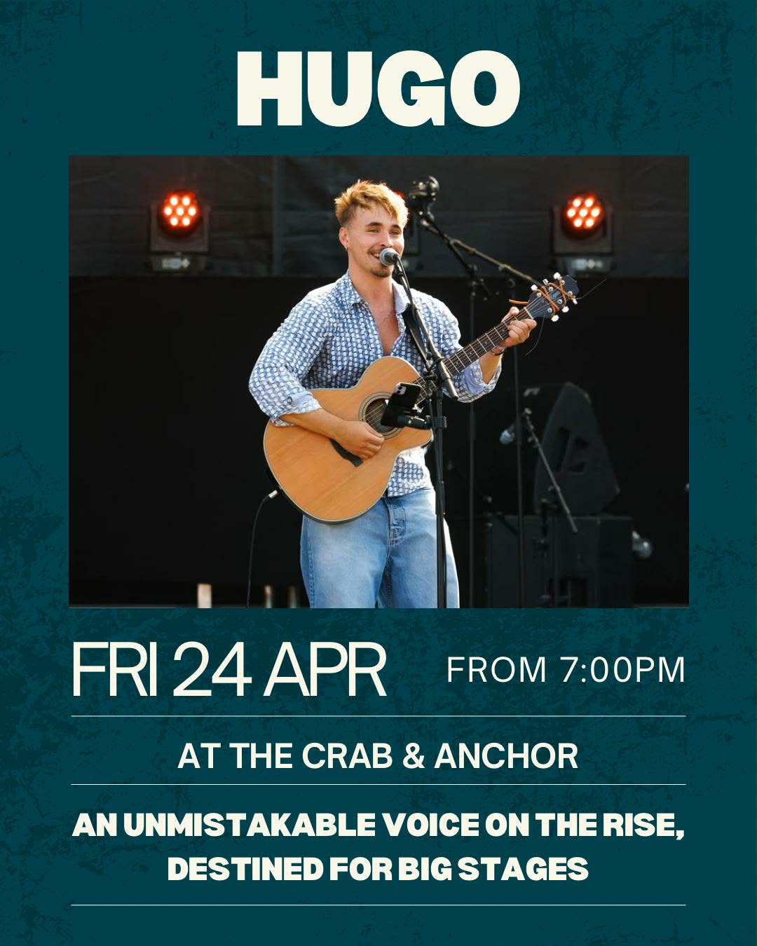 Join us on Friday, April 24th, from 7:00 PM at The Crab & Anchor for an unforgettable evening with the incredibly talented Hugo. Boasting an "unmistakable voice on the rise," Hugo brings a soulful repertoire and a world-class performance destined for big stages. It’s the perfect atmosphere for a premium night out with friends or family.