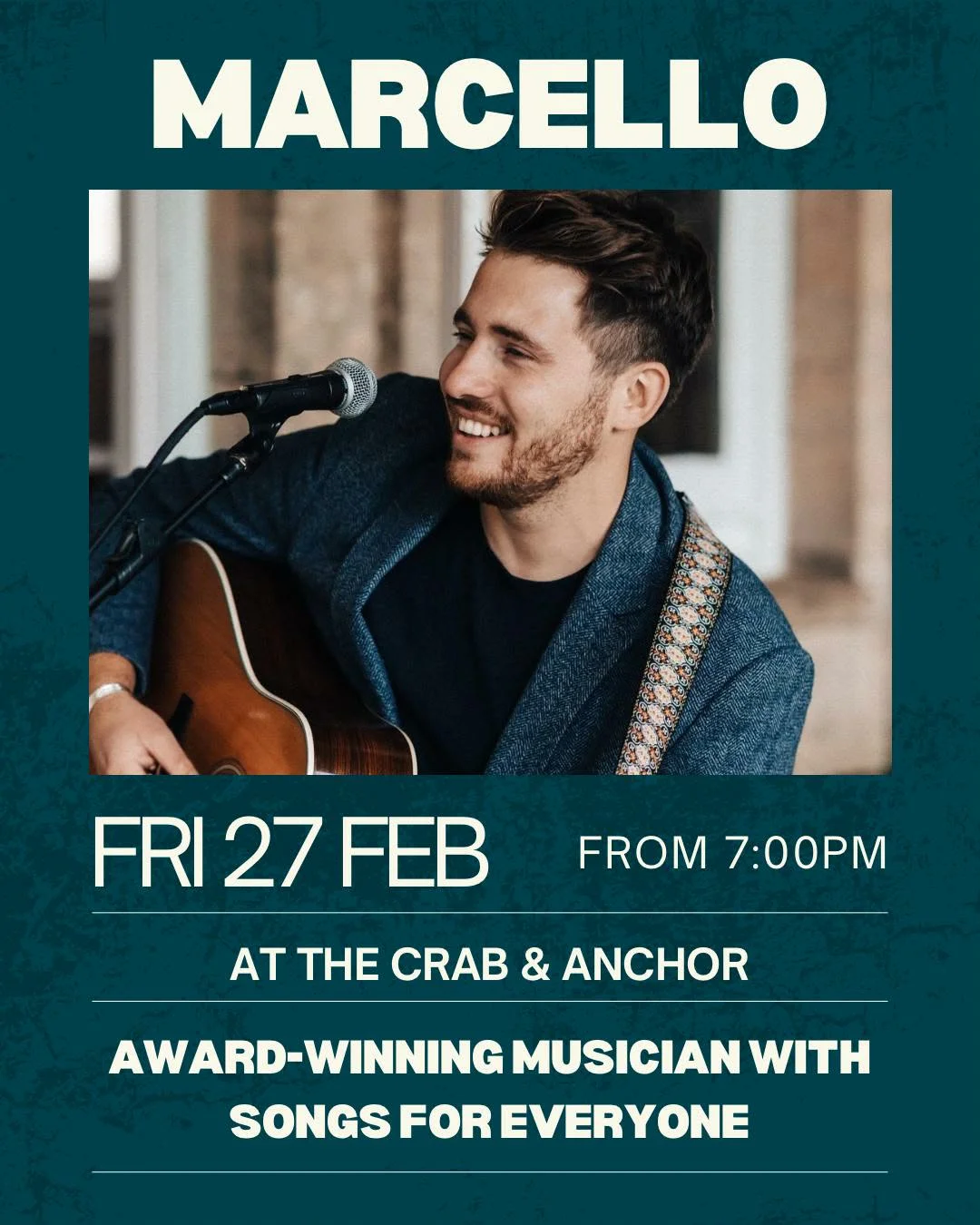 Join us on Friday, February 27th, from 7:00 PM at The Crab & Anchor for a special performance by the award-winning musician, Marcello. With a repertoire of songs for everyone, it’s the perfect atmosphere for a night out with friends or family.